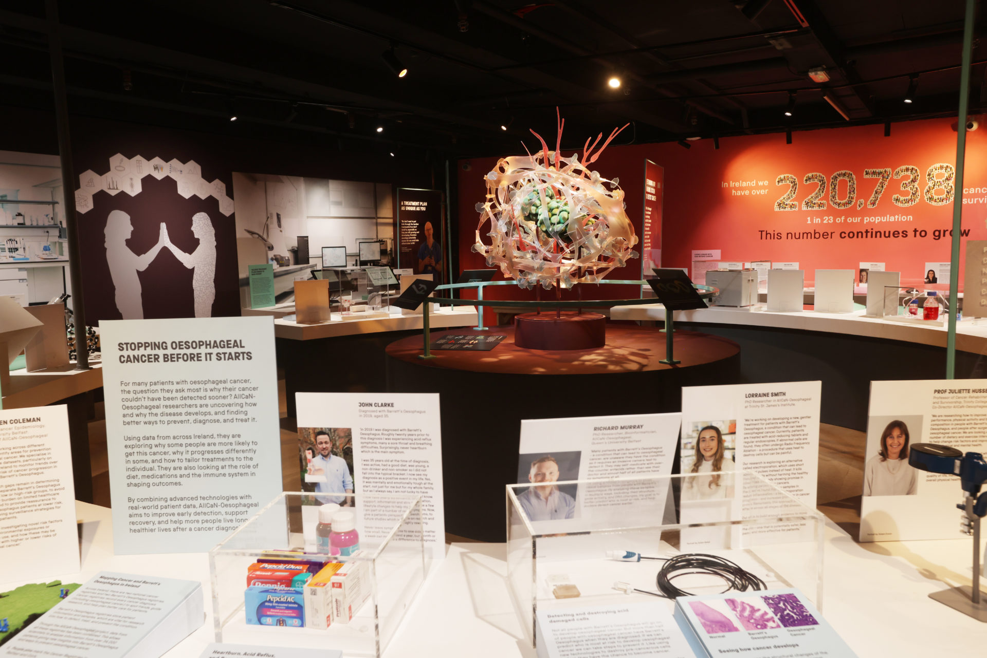 Personal stories from voices including Michael Flatley, broadcaster Evelyn O’Rourke and John Brennan sit alongside interactive exhibits that let you explore how cancer works.