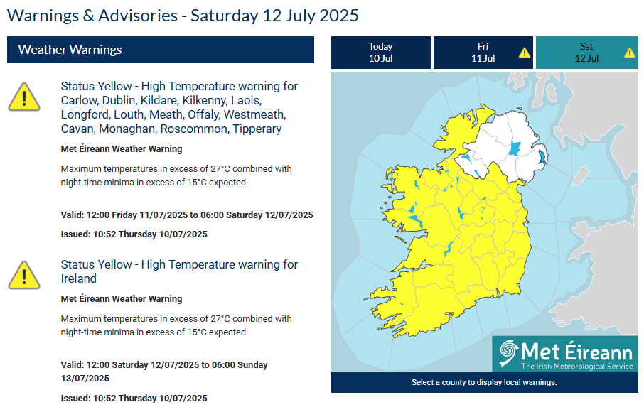Status yellow high temperature warnings have been issued from Met Eireann for the next two days.